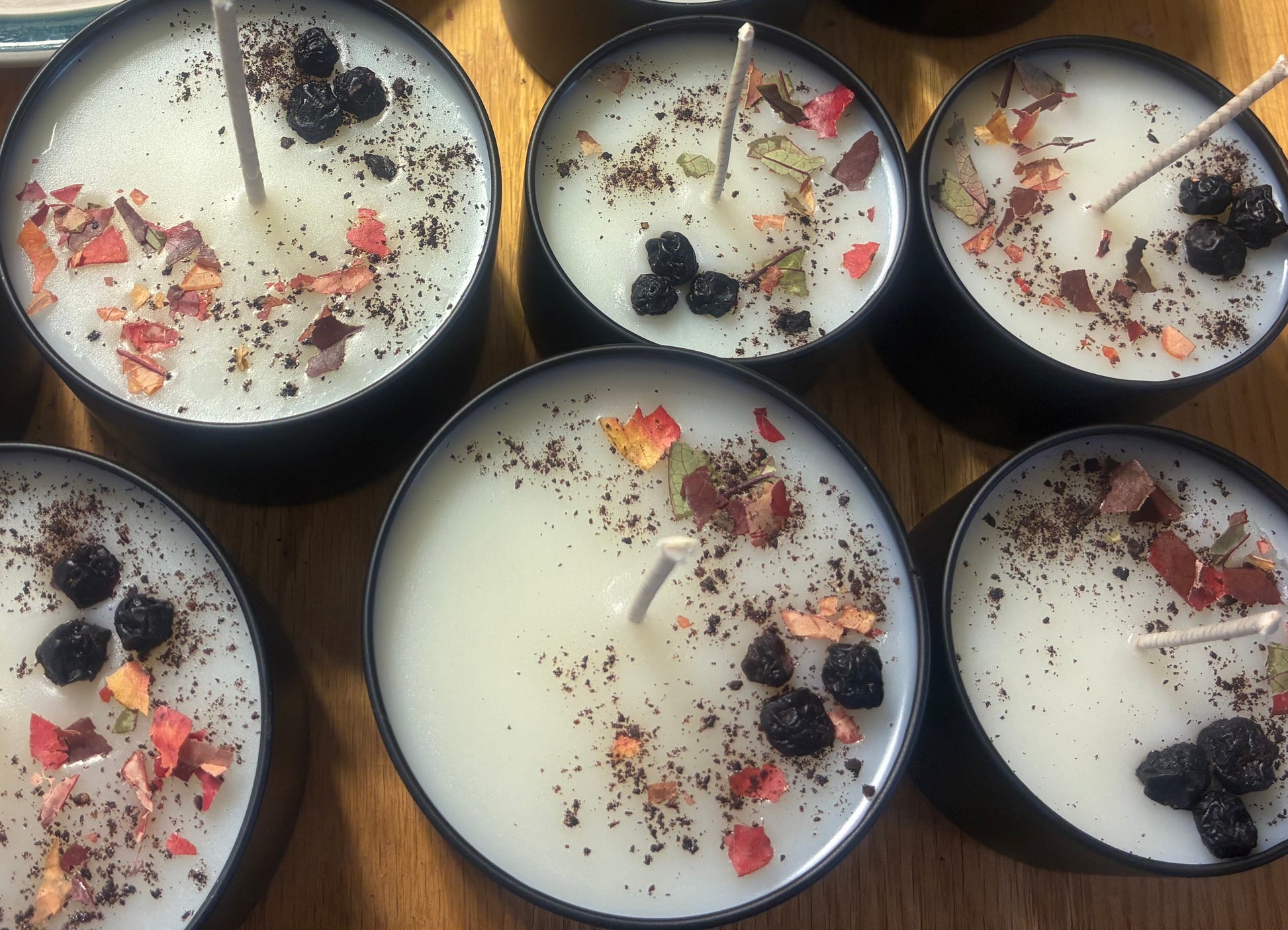 Décorations : Feuilles de bleuetiers, bleuets déshydratés et poudre de bleuets sauvages.